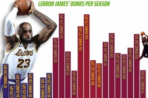 詹姆斯生涯各季扣篮数:本赛季97扣湖人生涯新高 生涯最高为145扣