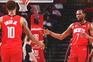 本场比赛杜兰特16中12砍下29分7篮板2助攻2抢断2盖帽;小贾巴里·史密斯14中8砍下23分4篮板2助攻2抢断。